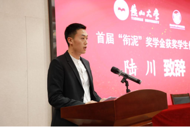 2018级旅游管理专业陆川作为获奖学生代表发言。陆川汇报了自己的学习和参军经历,表达了对学校老师培养和王海军学长关爱的感激之情,表示未来将回馈母校,不负老师和学长之恩。