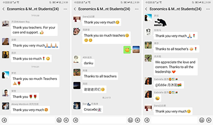 院长李春玲、正处级辅导员刘琳、副院长陈晶璞、副书记张志超、科研与研究生科闫东梅一行,与国际教育学院常务副院长张文莉、副院长姜炼、副处级辅导员冯清华、学生科科长葛玮,共同看望慰问了目前在校的22名经济、管理相关学科专业本硕博留学生。