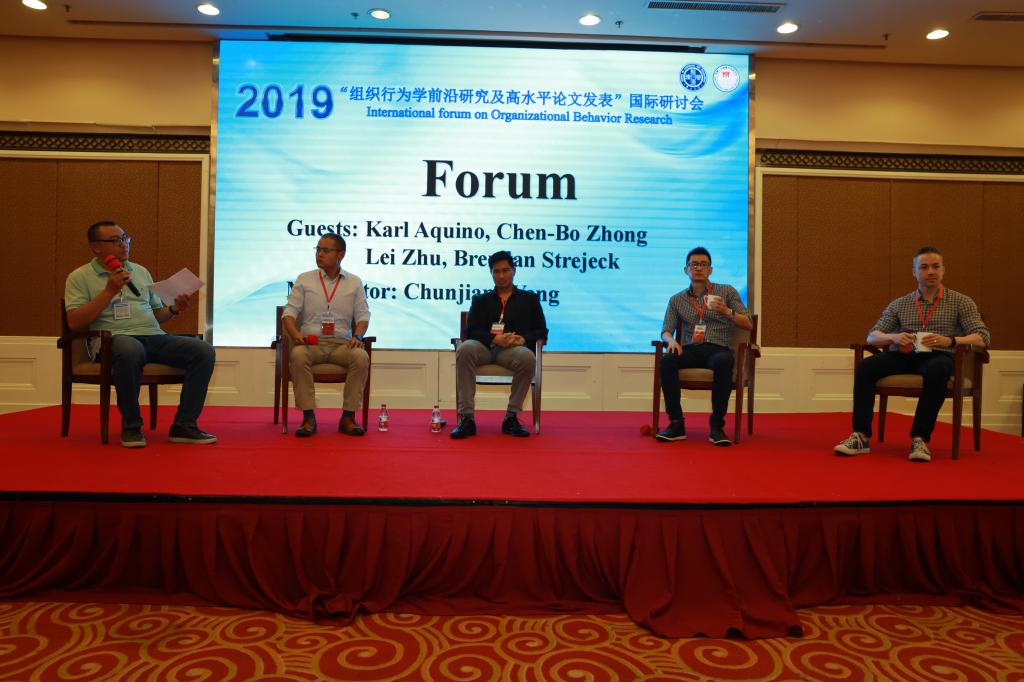 在公开讨论议程中,Aquino教授、钟晨波教授、祝磊副教授和Brendan Strejeck博士,围绕“如何提高论文的英文写作水平”、“如何提升高水平论文的发表能力”、“如何克服研究中遇到的障碍”、“做负责任的管理研究”、“避免研究中的数据驱动”、“如何选择目标期刊”等问题,进行了开放讨论和坦诚交流。