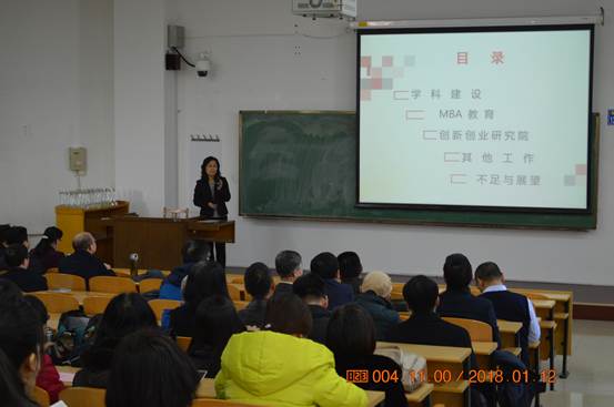 会上,李春玲院长首先对一年来学院整体工作进行了全面总结,内容包括学科建设、MBA教育、创新创业教学等各个方面,特别梳理汇总了学院一年来取得的成绩,并强调一个个成绩的取得是全院教职工共同努力的结果。成绩提振人心,鼓舞士气,不足和展望也让全院教职工明确了2018年努力的方向。“幸福都是奋斗出来的!建设有情怀的经管学院,我们一起努力!”这是院长与全院教职工的共勉。