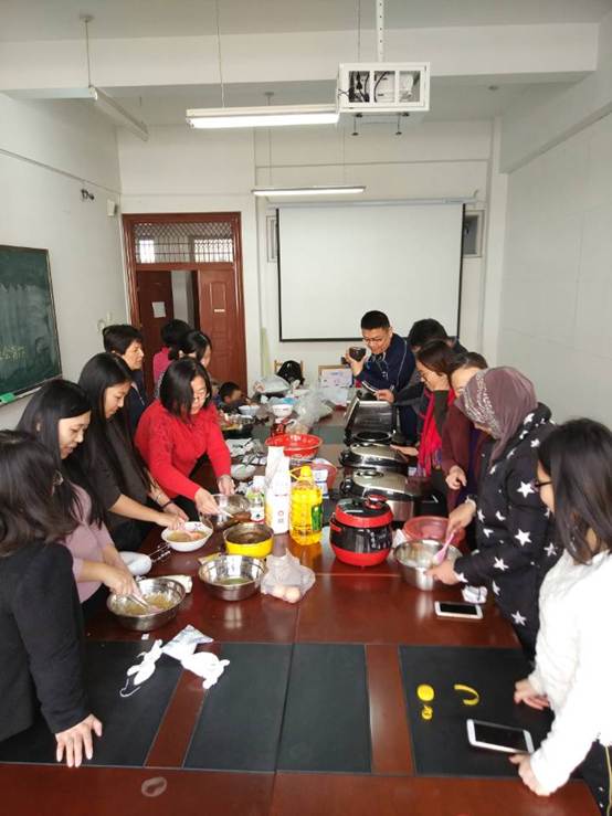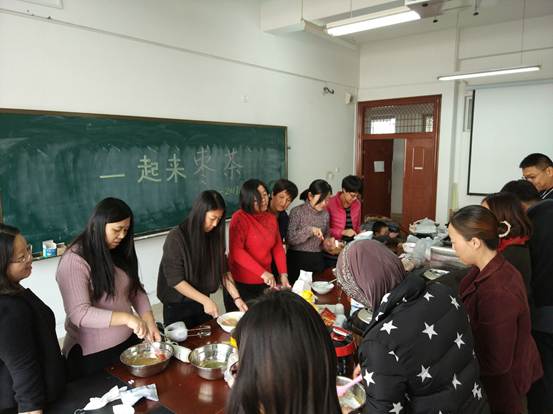 不到10点,教职工就络绎不绝的抵达了烘焙活动室。活动过程中,学院教师热情高涨,在有经验的老师指导下,积极配合,耐心、细心地进行各种准备工作。从做枣糕前的准备到制作过程中蛋液搅打、调糊、注模、烘烤等各个环节,大家现学现做、互帮互助,既学习了中式烘焙的基础知识和制作方法,又切实的感受到了中国饮食的独特魅力。一位路过的巴基斯坦籍博士研究生同学也被吸引了过来,加入了工会老师们的队伍。在各位老师与“国际友人”灵巧的双手下,一个个精美独特的枣糕呈现在大家面前,空气中弥漫着糕点的香甜,室内洋溢着教职工热络的交谈。