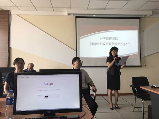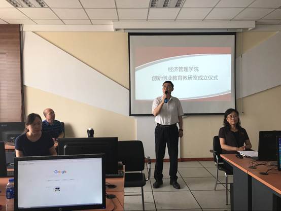 “创新创业教育教研室”。具体介绍了组织架构、部门职责、人员构成及相关制度。随后,副校长赵永生指出:第一,创新创业教育教研室的成立对学院以及对学校是标志性事件,标志着我校的创新创业教育进入崭新的阶段。第二,希望教研室的成立能够更好的承接全校创新创业教育任务,形成教学、实训、科研、实践为一体的高素质团队。第三,希望教研室能够以教学为前提,科研并重。最后提出要以“高站位、国际视野”,通过5年使我校的创新创业教育在国内产生影响,10年后我们走在国内前列,最终踏踏实实走向国际。