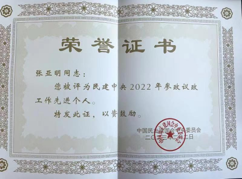 张亚明教授被评为民建中央2022年参政议政工作先进个人。