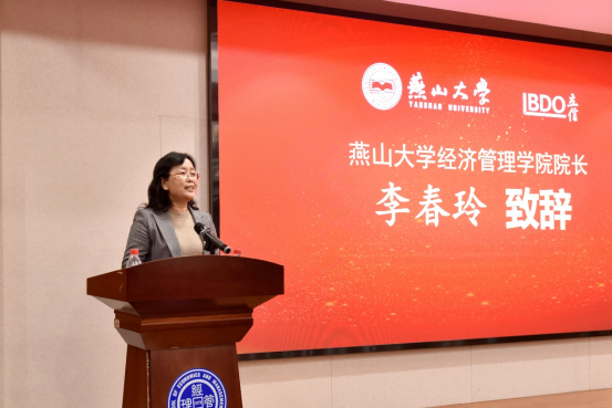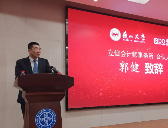 李春玲致辞,对郭健校友胸怀母校,助力发展表示衷心感谢;对立信会计师事务所(特殊普通合伙)央企事业总部捐资助学表示由衷赞赏;对郭健校友成为研究生校外导师,以新身份重归母校表示热烈欢迎。李春玲希望未来双方加强协作,互利共赢。