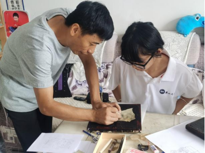 在卢老师的悉心指导下,队员们认真学习雕刻皮影的手艺。从绘制影谱到蜡版雕刻,从上色装订再到清漆涂刷,每一个步骤都需小心进行。在雕刻过程中,有的队员雕刻皮影磨破了手,包上创可贴继续拿起刻刀;有的保持一个姿势上色,久了腰酸背痛,但仍坚持把工作做完。功夫不负有心人,队员们最终成功制作出属于自己的作品。