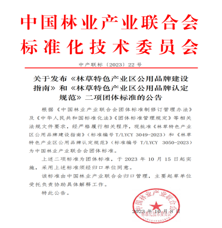 《林草特色产业区公用品牌认定规范》(标准编号T/LYCY 3050-2023)规定了林草特色产业区公用品牌的术语和定义、认定原则、认定对象、认定品牌类型、认定指标、认定程序、品牌使用和动态管理等。