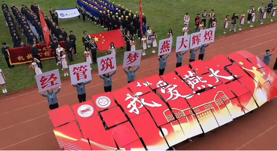 教师方阵成为全校璀璨亮点,统一的院服下,是心跳与步伐的同频默契;整齐的队列里,是精神抖擞、积极向上的生动写照;每一次踏步,都是团结一致的力量宣言,手举标语牌拼成“经管筑梦,燕大辉煌”的口号。看台上的观众们也整齐划一的喊出嗨皮漫画
