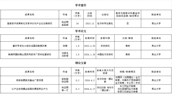 互联网+与产业发展研究中心、省重点联系智库河北数字经济与康旅文化产业研究院共同支撑。其中,经济科学出版社出版专著《高新技术成果转化效率评价与产业化对策研究》受河北省教育厅重大攻关项目等8项省部级成果支撑。刊发于《经济日报·理论版》(2024年4月2日第10版)的理论文章《持续拓展数实融合广度深度》以及刊发于《河北日报·理论版》(2024年4月17日第07版)的理论文章《以产业协同耦合培育发展新质生产力》被“光明网”“中国共产党新闻网”“中国经济网”“人民论坛网”“人民日报·人民号”等中央权威媒体全文转载。