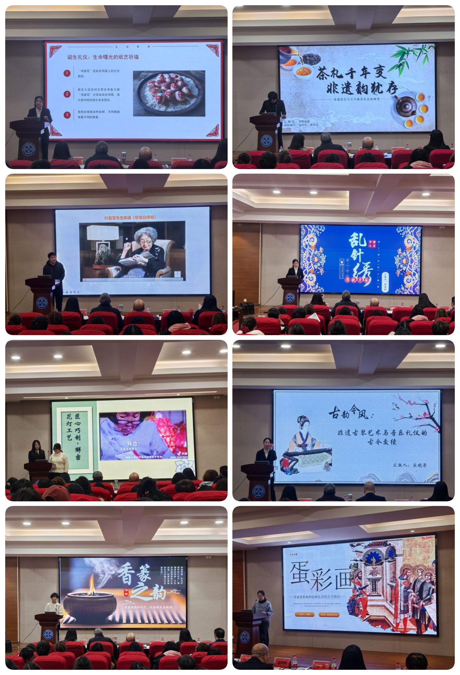 随着主持人宣布比赛开始,十九组在初赛中脱颖而出的参赛选手轮流上台进行汇报。汇报的主题包括非遗咏诵、非遗香篆、非遗乱针绣等不同的非遗项目,涵盖了传统曲艺、传统技艺、民间技术等多个领域。这些非遗项目不仅是历史的见证,更是民族灵魂的载体。选手们在比赛过程中展示了扎实的礼仪知识和答辩技巧,更在非遗文化的融入上展现出独特的创意和深刻的理解。在这里,每一位选手都是文化的使者,每一份努力都是对传统的致敬。