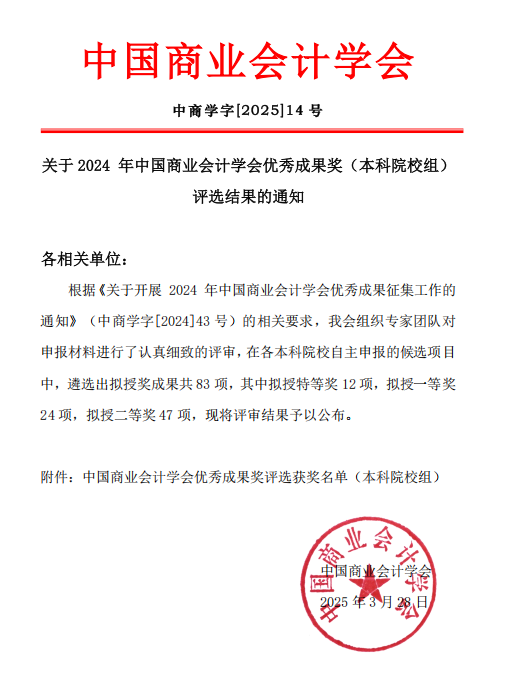 中国商业会计学会是经民政部批准,由财会领域从事研究与实务的有关单位和人员自愿结成的全国性、学术性、非营利性社会组织,是国家一级学会。学会致力于发展成为会计理论和实践领域的高端智库,推动会计专业教育的改革和发展、推动企事业单位会计工作的转型和升级、推动多层次会计人才的培养和提升。本次开展的优秀成果征集评选活动,旨在表彰在会计理论研究、教学改革、实践创新等方面取得突出成绩的个人和团队,吸引了国内众多高校的参与。