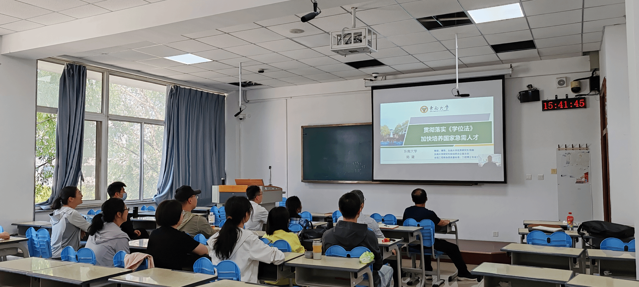 随后,全体教师集中观看了东南大学陆建教授主讲的“贯彻落实《学位法》加快培养国家急需人才”的专题视频讲座。陆教授首先阐述了学位法的重要意义,介绍了我国研究生教育发展趋势。然后详细说明了从《学位条例》到《学位法》的主要修订内容。接着强调“分类发展”是研究生教育时代要求。最后指出新时代研究生导师的责任与担当。讲座内容深入浅出,现场教师认真记录要点,并就相关问题展开初步讨论。