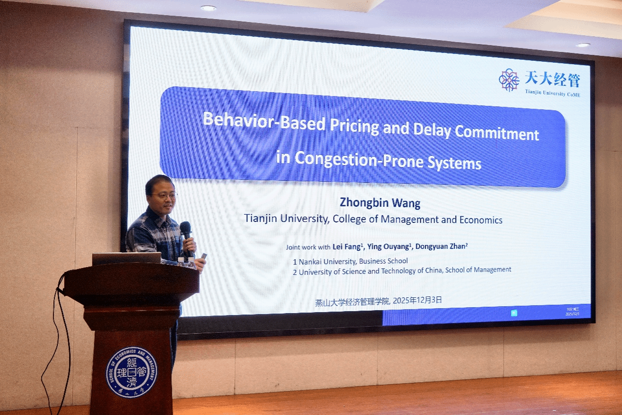 在报告中,王钟彬教授围绕外卖平台的基于行为的定价(BBP)展开讲解,指出平台通过大数据区分新老用户使得“杀熟”现象成为可能,但已有研究对由需求增长带来的拥堵效应关注不足。该研究基于结合排队系统的两期动态博弈模型,系统分析了服务延迟在拥堵环境下对平台和消费者的影响,并揭示了BBP在此类系统中的作用机制。研究结果表明,BBP通常会加剧平台面临的运营压力,却在一定程度上提升消费者的受益。为改善这种不均衡,该研究提出“两期延迟承诺”策略,通过在两个阶段中提前承诺服务延迟水平,有助于缓和平台间的服务竞争、改善平台收益,并调整BBP对消费者的影响,使系统运行更加高效。