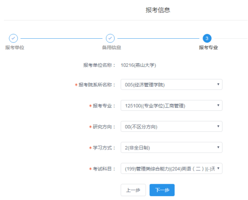 ),报考专业为125100(工商管理),研究方向为00(不区分方向),学习方式为2(非全日制),报考类别为12(定向就业),考试科目为(199)管理类综合能力、(204)英语或其他语种。具体如下图: