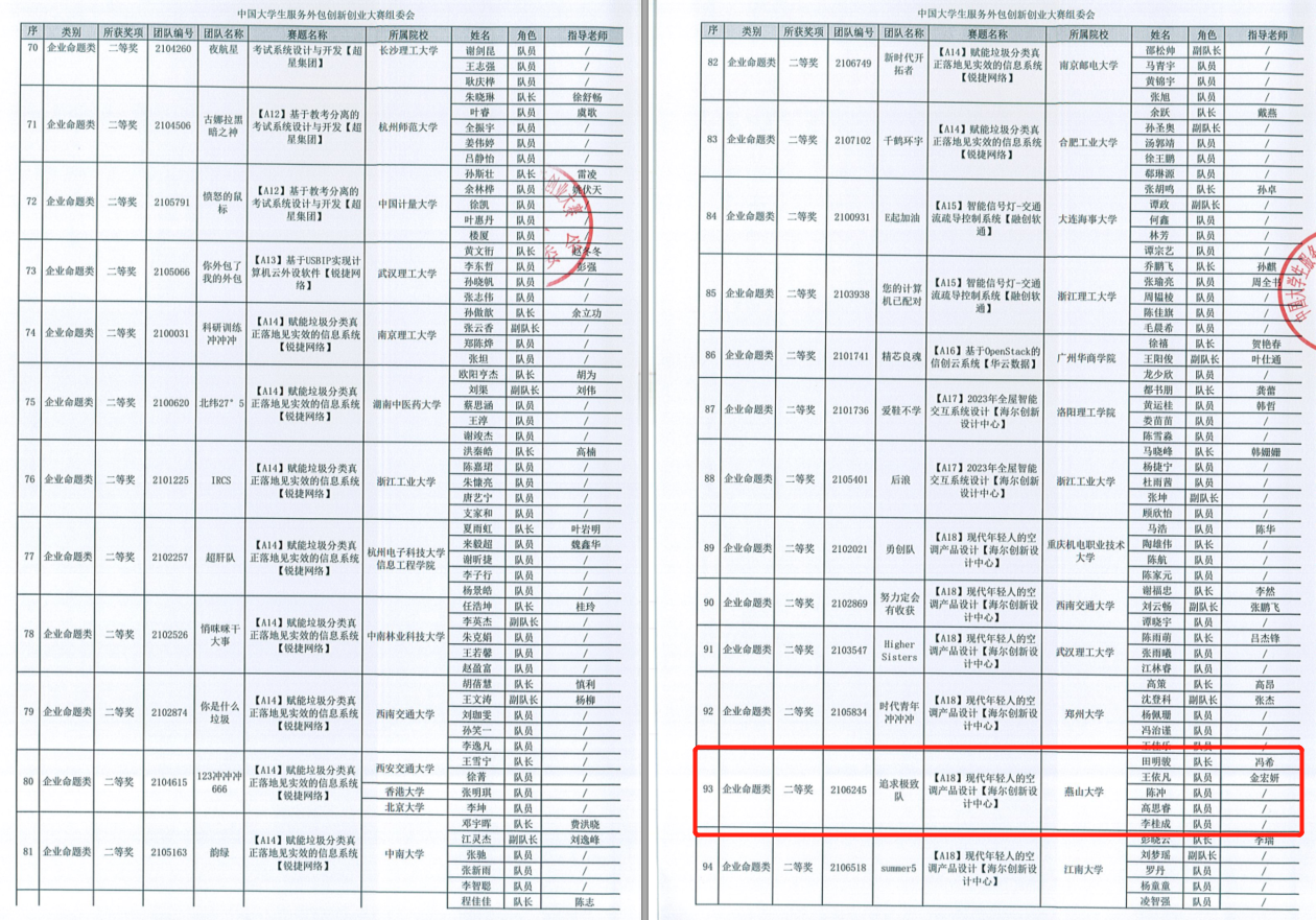 参赛团队“追求极致队”项目负责人田明骏主导的项目《现代年轻人的空调产品设计【海尔创新设计中心】》荣获企业命题类二等奖,“燕翎团队”项目负责人张翮翔主导的项目《深楠科技-全方位服务社会公共安全领域》荣获创业实践类三等奖。