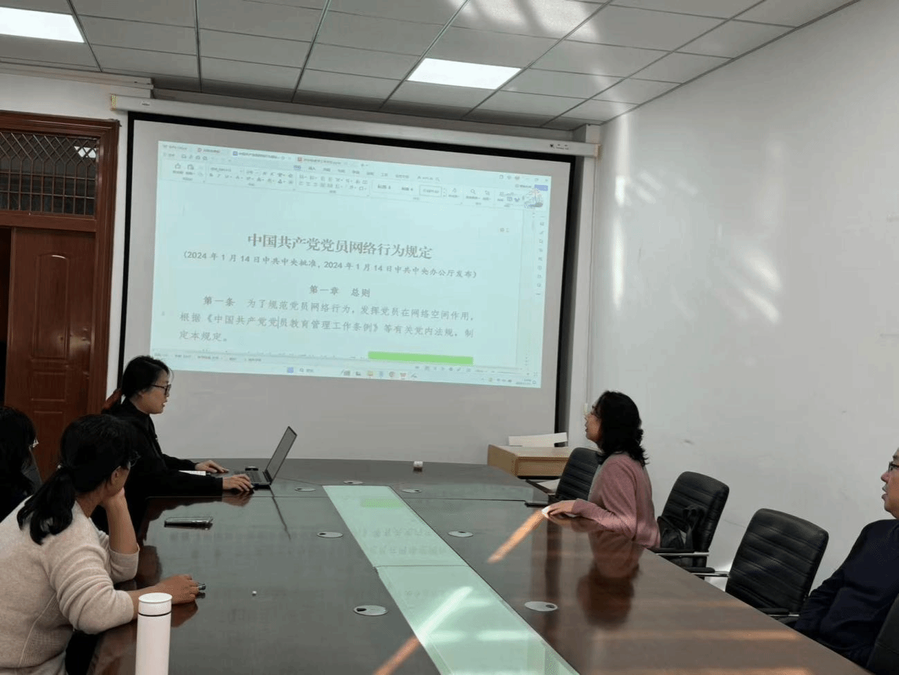 本次学习内容主要分为两部分。首先。党支部书记王艳亮带领大家学习《中国共产党党员网络行为规定》文件相关内容,并就其中重点涉及高校教学、科研相关工作的内容重点解读。