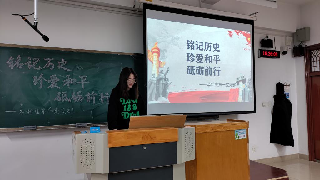 本科生第一党支部在西区第五教学楼C307教室开展了12月份“一月一主题”党日活动,本月活动主题为“铭记历史,珍爱和平,砥砺前行”。本次党日活动在本科生第一党支部所有成员的努力下取得了圆满成功。