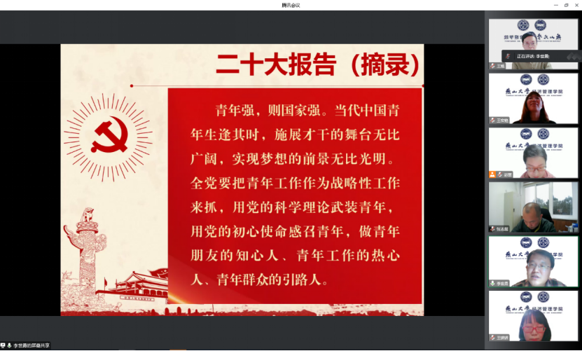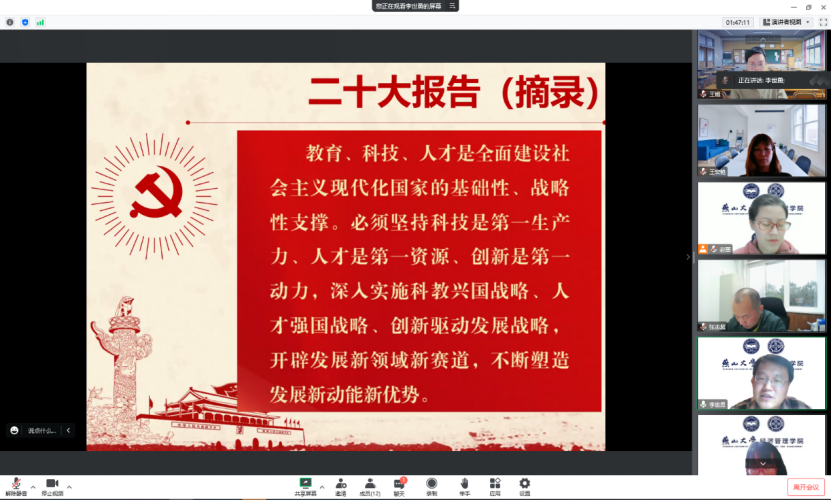 李世勇首先带领全系教师深入学习了党的二十大报告中跟教育相关的重要论述,深刻领悟了要“全面贯彻党的教育方针,落实立德树人根本任务,培养德智体美劳全面发展的社会主义建设者和接班人”。最后,李世勇提出了要将学习贯彻党的二十大精神具体落实到电子商务系的中心工作上来,扎实开展电子商务系的人才培养工作,努力开创电子商务系国家级一流本科专业建设工作的新局面。张志超副书记结合立德树人根本任务提出了几点要求,希望各位老师在日常工作中多关注学生思想多关心学生成长,为国家培养更多的优秀人才。