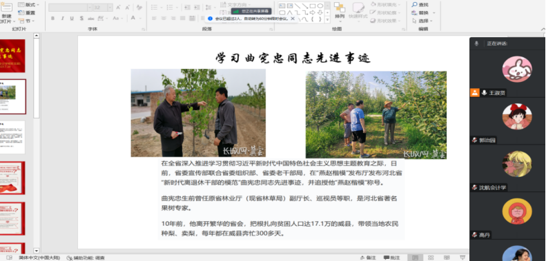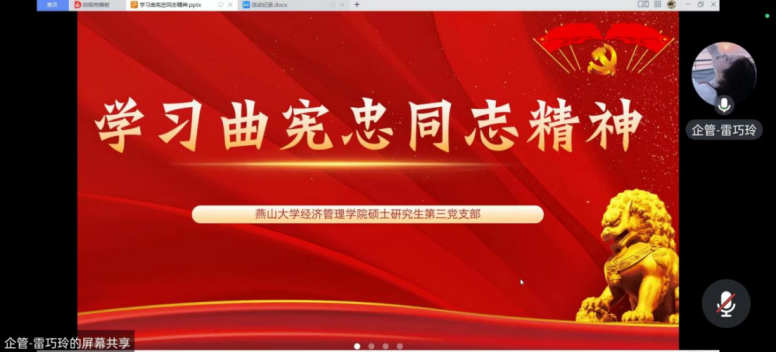 硕士研究生第三党支部于2023年7月29日开展线上“学习曲宪忠同志先进事迹”主题党日活动。本次活动以党小组为单位分四组展开学习,各组由党小组长主持并记录学习过程。