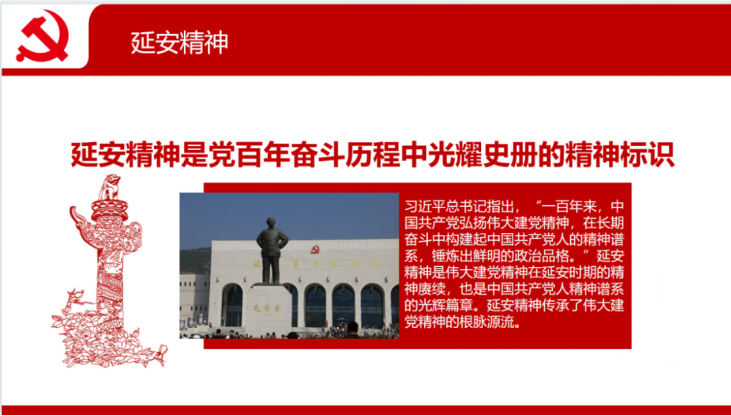此次展示会的主题为《走进延安革命纪念馆》,由党员韩文星同学主持会议。展示会共分为“延安革命纪念馆介绍”、延安精神“、“游览感想”三个部分。在第一部分中,韩文星同学为我们介绍了位于延河畔的浓缩了13年红色风云的延安革命纪念馆,在生动的介绍下,一幅幅泛黄的历史照片、一段段厚重的史料文字、一件件质朴的实物仿佛出现在党员们面前。在第二部分中,韩文星同学为党员们介绍延安精神,延安精神是党在延安十三年凝结的宝贵精神财富,是伟大建党精神在延安时期的精神赓续,也是中国共产党人精神谱系的光辉篇章。在第三部分中,韩文星同学对游览感想进行总结:游览延安革命纪念馆时,我们了解到延安是中国革命的圣地,也是中国革命文化的重要源泉。这里保存着大量珍贵的历史资料和文物,使我们对中国革命历史和文化有了更加深入的了解。此外,在红军长征纪念馆里,展馆运用声光电等现代科技手段,增强陈列的动态效果,使人身临其境,我们看到了衣衫褴褛的红军跋山涉水历经千辛万苦到达陕北,党中央和毛泽东同志入驻延安,从此荒无人烟的陕北高原成为中国革命的摇篮,成为亿万优秀青年魂牵梦萦的圣地。展厅里的每个物件都在叙述红军壮丽的事迹和无畏的精神,我们感受到了中国革命的艰辛和无私奉献的精神,进一步了解了中国革命走向伟大胜利的历史进程。延安创造一个又一个的奇迹,创造了中国革命的奇迹,谱写了中华民族全新的历史!我们相信,在今后的旅行中,我们还会继续前往更多红色景点,去感知更多的历史和文化的魅力,去加深我们对中国的历史和文化有了更深层次的理解和认同。